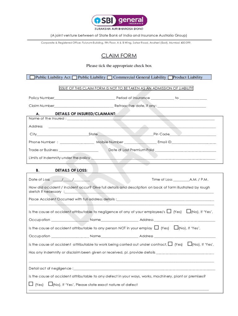 (A joint venture between of State Bank of India and Insurance Australia Group) Corporate & Registered Office: Fulcrum Building, 9th Floor, A & B Wing, Sahara Road, Adhere (East), Mumbai 400 099.CLAIM