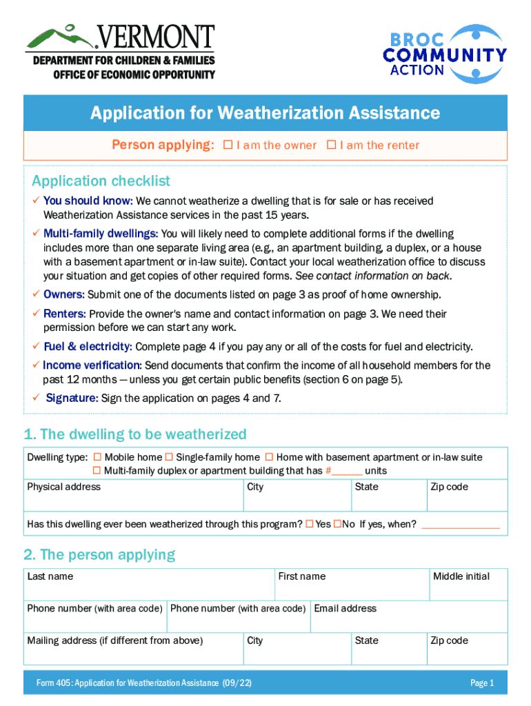 Application for Weatherization Assistance Person applying: I am the owner I am the renterApplication checklist You should know: We cannot weatherize a dwelling that is for sale or has received Weatherization