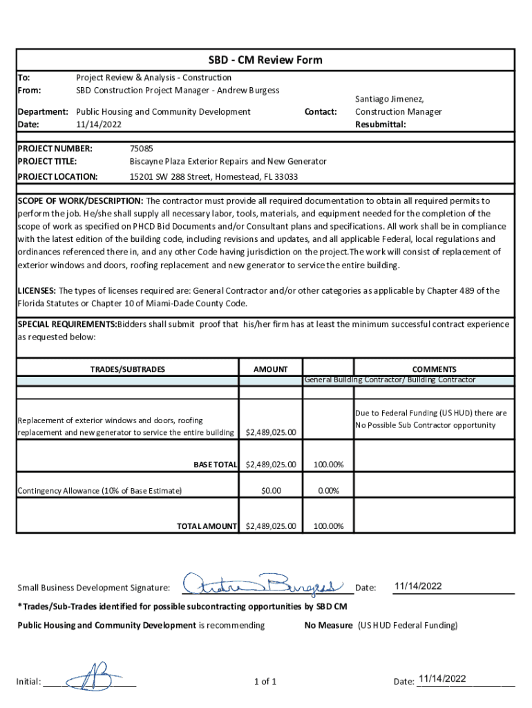 SBD CM Review Form To: From:Project Review & Analysis Construction SBD Construction Project Manager Andrew BurgessDepartment: Public Housing and Community Development Date: 11/14/2022Contact:PROJECT