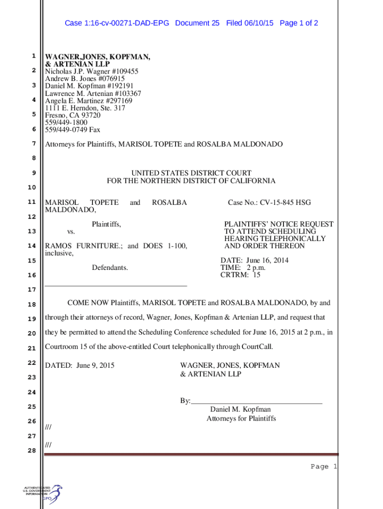 Case 1:16cv00271DADEPG Document 25 Filed 06/10/15-Page 1 of 216WAGNER,JONES, HOFFMAN, & ARMENIAN LLP Nicholas J.P. Wagner #109455 Andrew B. Jones #076915 Daniel M. Hoffman #192191 Lawrence M. Armenian