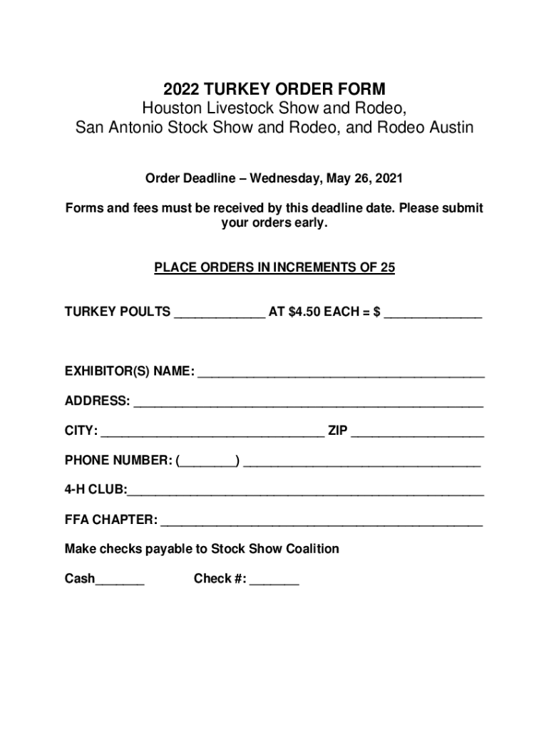 2022 TURKEY ORDER FORM Houston Livestock Show and Rodeo, San Antonio Stock Show and Rodeo, and Rodeo Austin Order Deadline Wednesday, May 26, 2021, Forms and fees must be received by this deadline