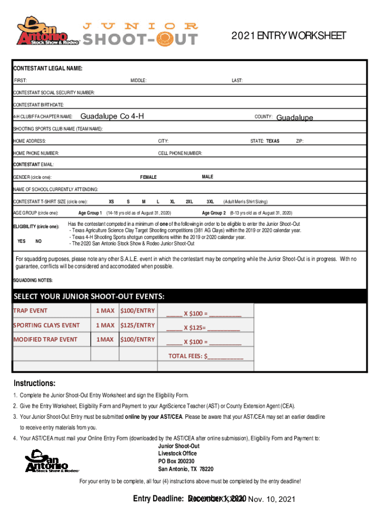 2021 ENTRY WORKSHEET CONTESTANT LEGAL NAME: FIRST:MIDDLE:LAST:CONTESTANT SOCIAL SECURITY NUMBER: CONTESTANT BIRTHDATE:Guadalupe Co 4H4H CLUB/FFA CHAPTER NAME:COUNTY:GuadalupeSHOOTING SPORTS CLUB NAME