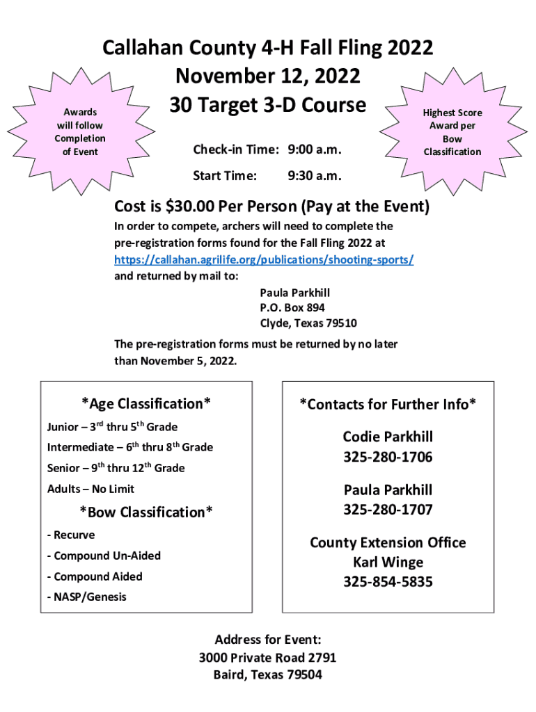 Callahan County 4H Fall Fling 2022 November 12, 2023 30 Target 3D Course Awards The Highest Score will follow Completion of EventAward per Bow ClassificationCheckin Time: 9:00 a.m. Start Time:9:30
