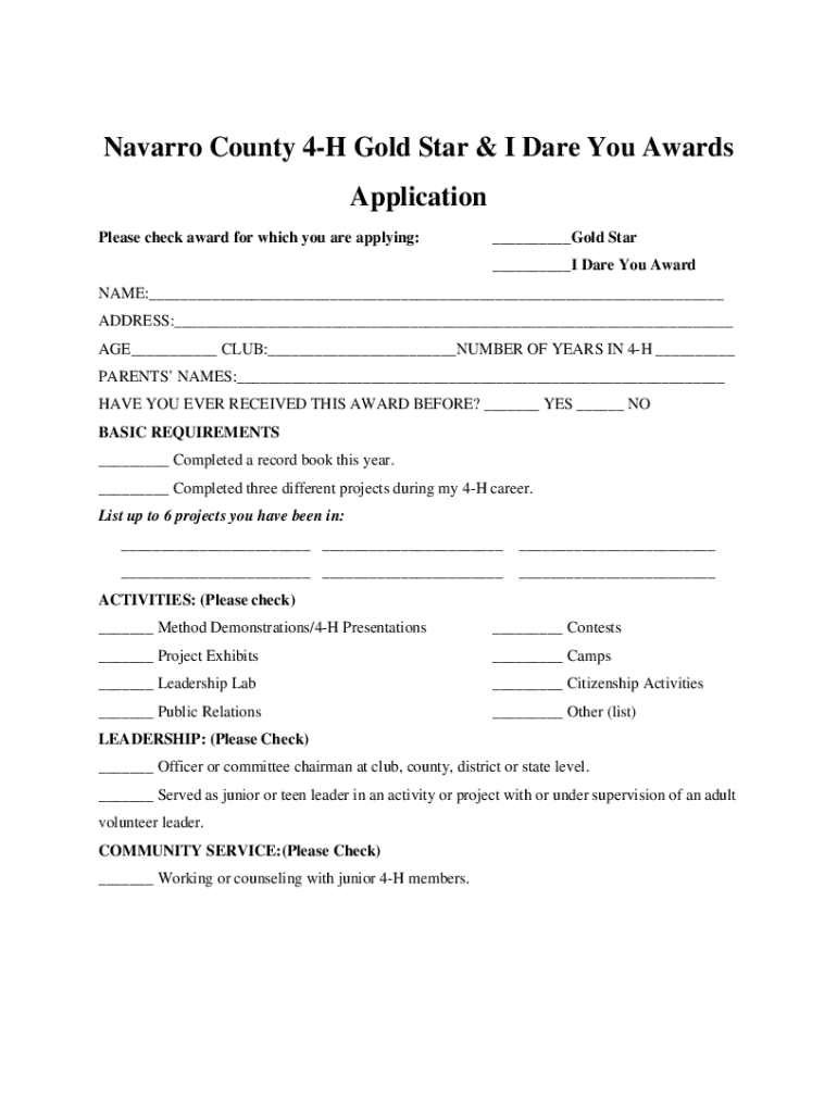 Get the free Navarro County 4-H Gold Star & I Dare You Awards Application