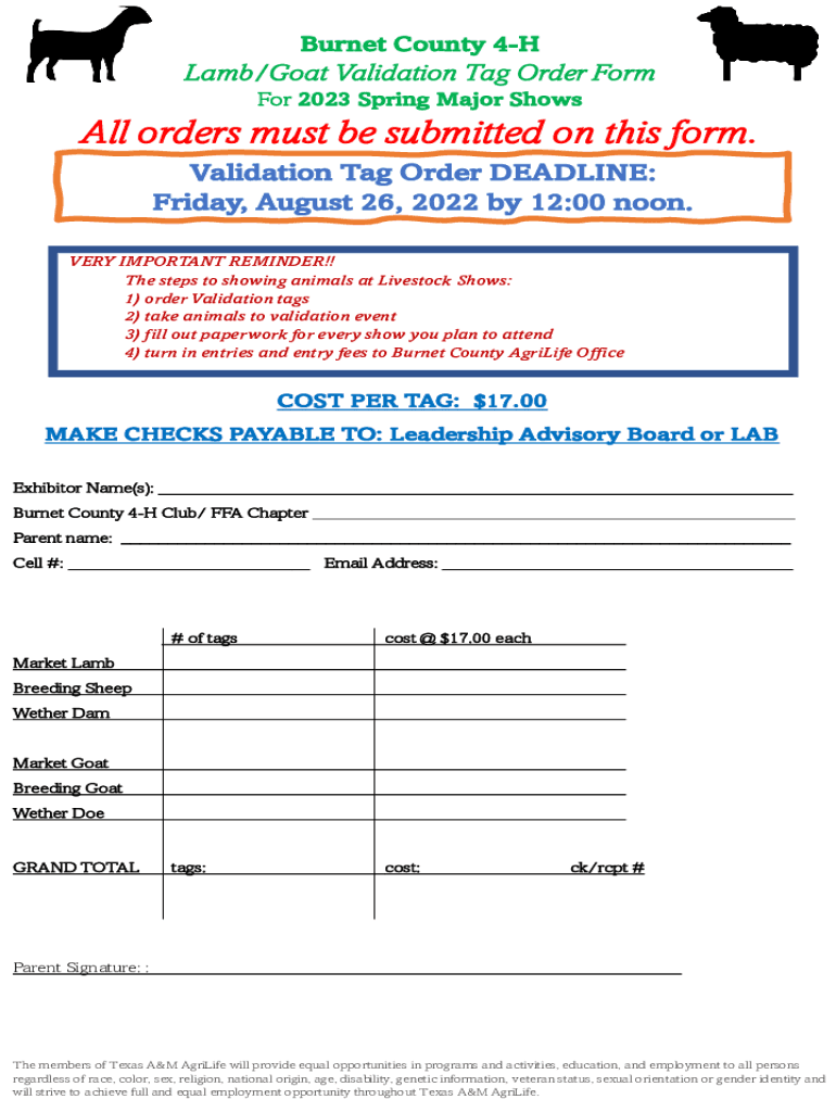 Burned County 4HLamb/Goat Validation Tag Order Form