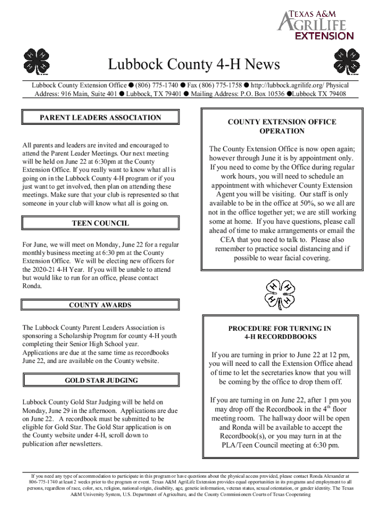 Information related to agricultural practices, gardening tips, nutrition, financial management, and youth programs may be reported on the Lubbock County Extension Office.