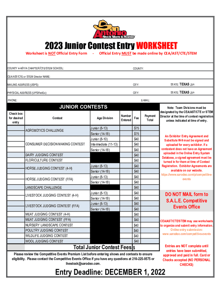 2023 Junior Contest Entry WORKSHEETWorksheet is NOT Official Entry Nonofficial Entry MUST be made online by CEA/AST/CTE/Nye County 4H/FFA CHAPTER/CTE/STEM SCHOOL:COUNTY:CEA/AST/CTE or STEM Director