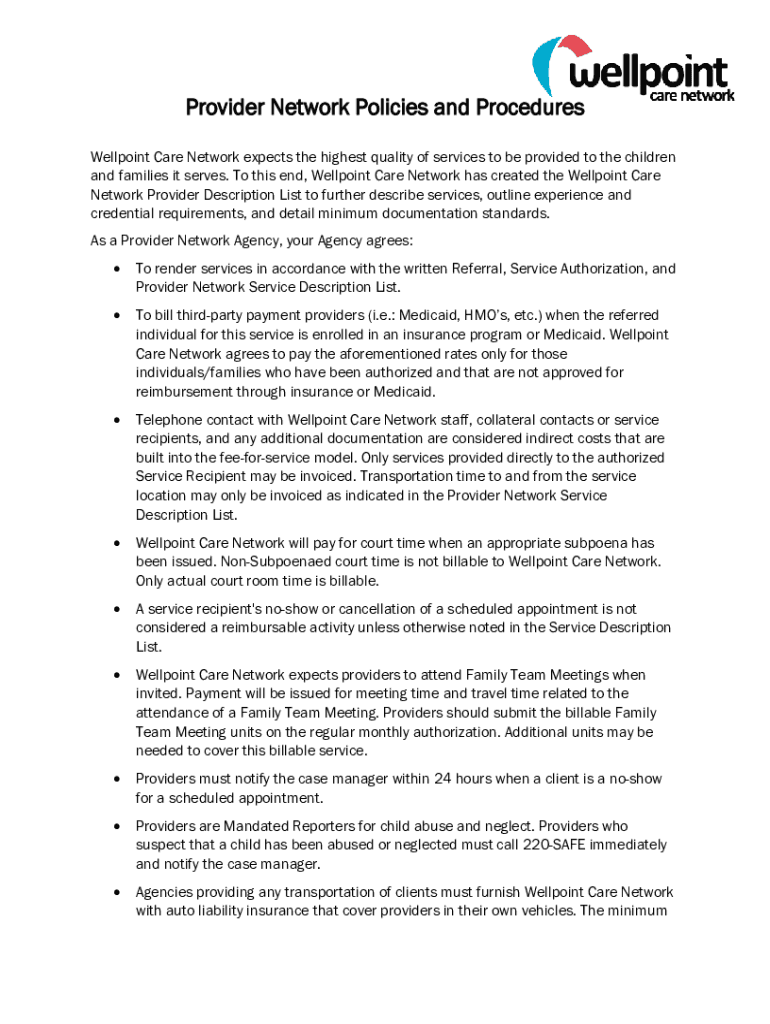 Provider Network Policies and Procedures Well point Care Network expects the highest quality of services to be provided to the children and families it serves. To this end, Well point Care Network