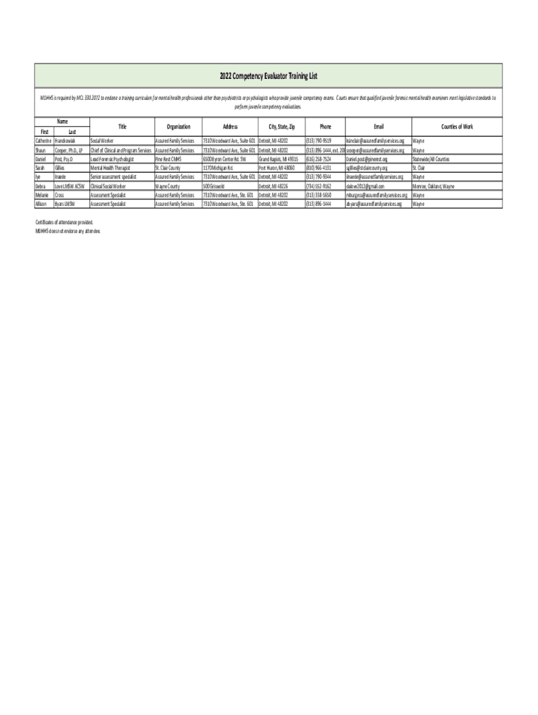 MD HHS is required by MCL 330.2072 to endorse a training curriculum for mental health professionals other than psychiatrists or psychologists who provide juvenile