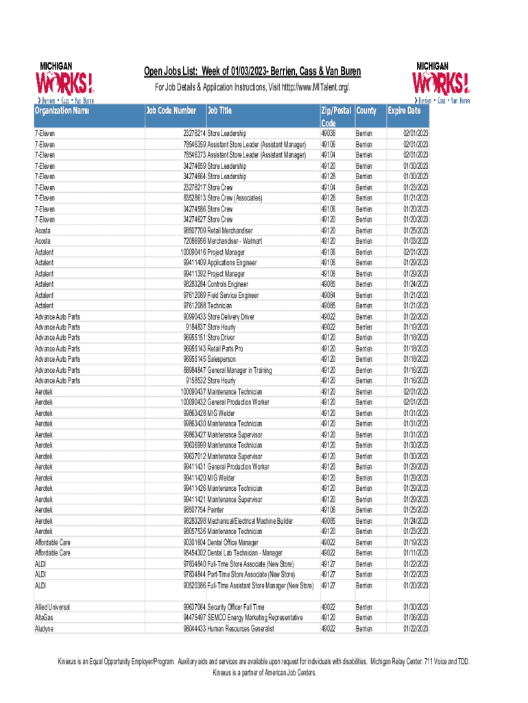 Open Jobs List: Week of 01/03/2023 Berries, Class & Van Buren