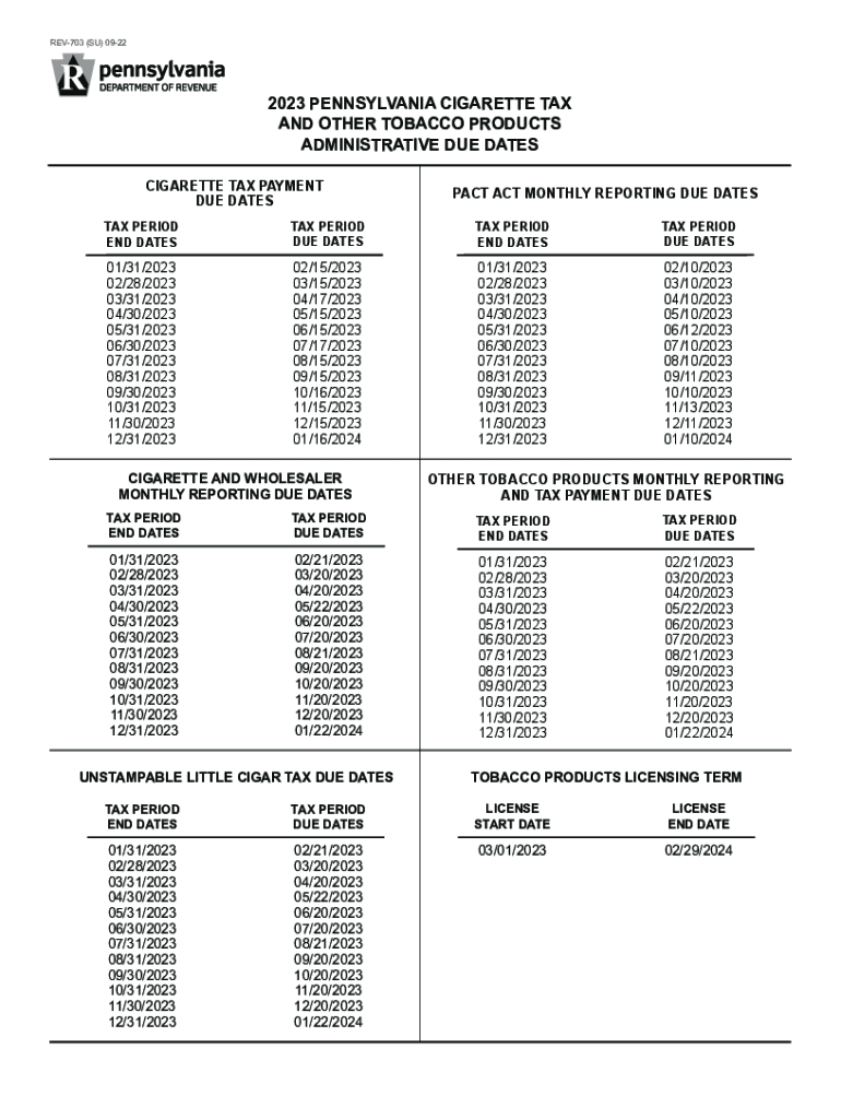 REV703 (SU) 09222023 PENNSYLVANIA CIGARETTE TAX AND OTHER TOBACCO PRODUCTS ADMINISTRATIVE DUE DATES CIGARETTE TAX PAYMENT DUE DATESET ACT MONTHLY REPORTING DUE DAGESTAN PERIOD END DAGESTAN PERIOD