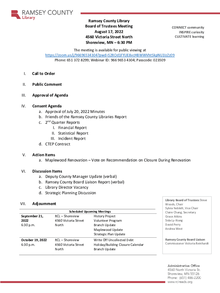 Ramsey County Library Board of Trustees Meeting August 17, 2023 4560 Victoria Street North Shore view, MN 6:30 CONNECT community INSPIRE curiosity CULTIVATE learning meeting is available for public