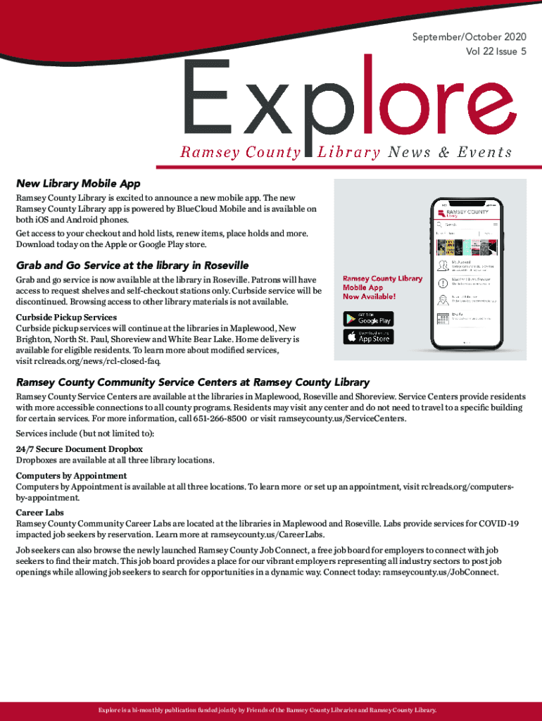 September/October 2020 Vol 22 Issue 5New Library Mobile App Ramsey County Library is excited to announce a new mobile app. The new Ramsey County Library app is powered byBlueCloud Mobile and is available