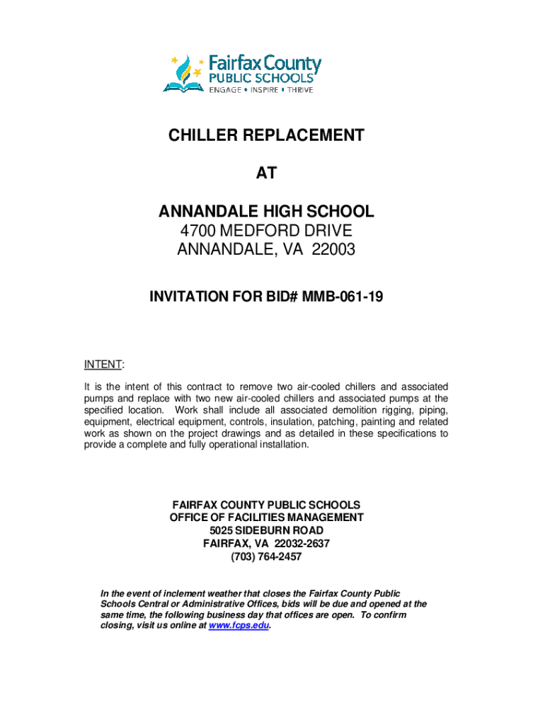 CHILLER REPLACEMENT AT ANNANDALE HIGH SCHOOL 4700 MEDFORD DRIVE ANNANDALE, VA 22003 INVITATION FOR BID# MMB06119INTENT: It is the intent of this contract to remove two air cooled chillers and associated