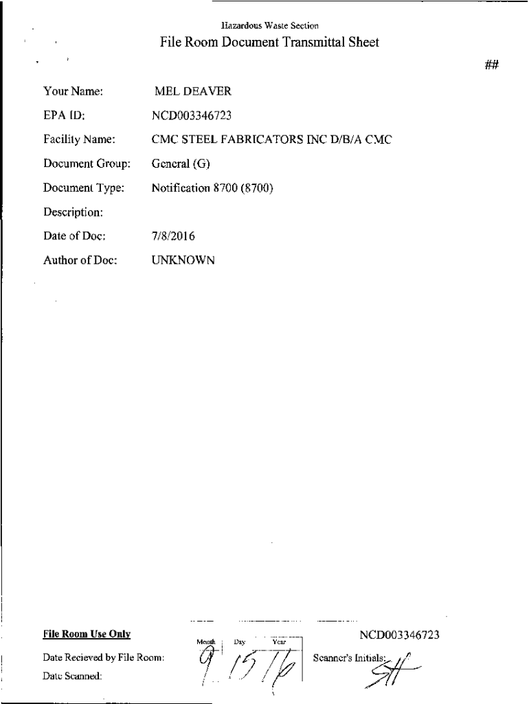 Your Name:MEL BEAVERED ID:NCD003346723Facility Name:CMC STEEL FABRICATORS INC D/B/A Document Group:General (G)Document Type:Notification
