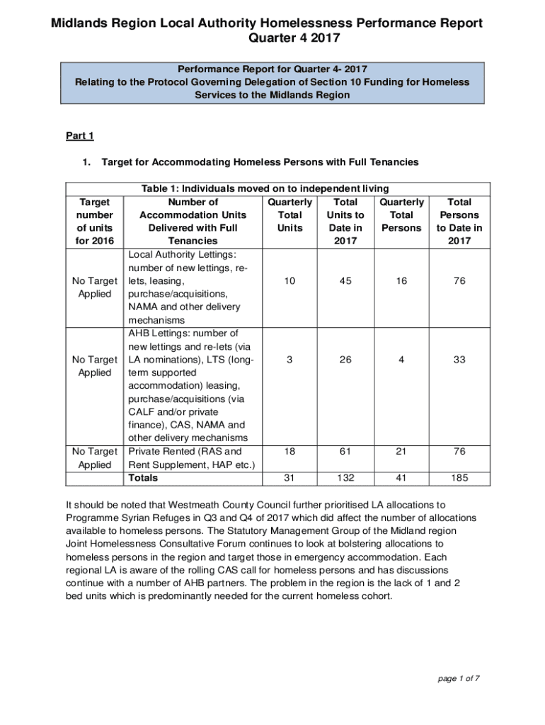 Midlands Region Local Authority Homelessness Performance Report Quarter 4 2017 Performance Report for Quarter 4 2017 Relating to the Protocol Governing Delegation of Section 10 Funding for Homeless