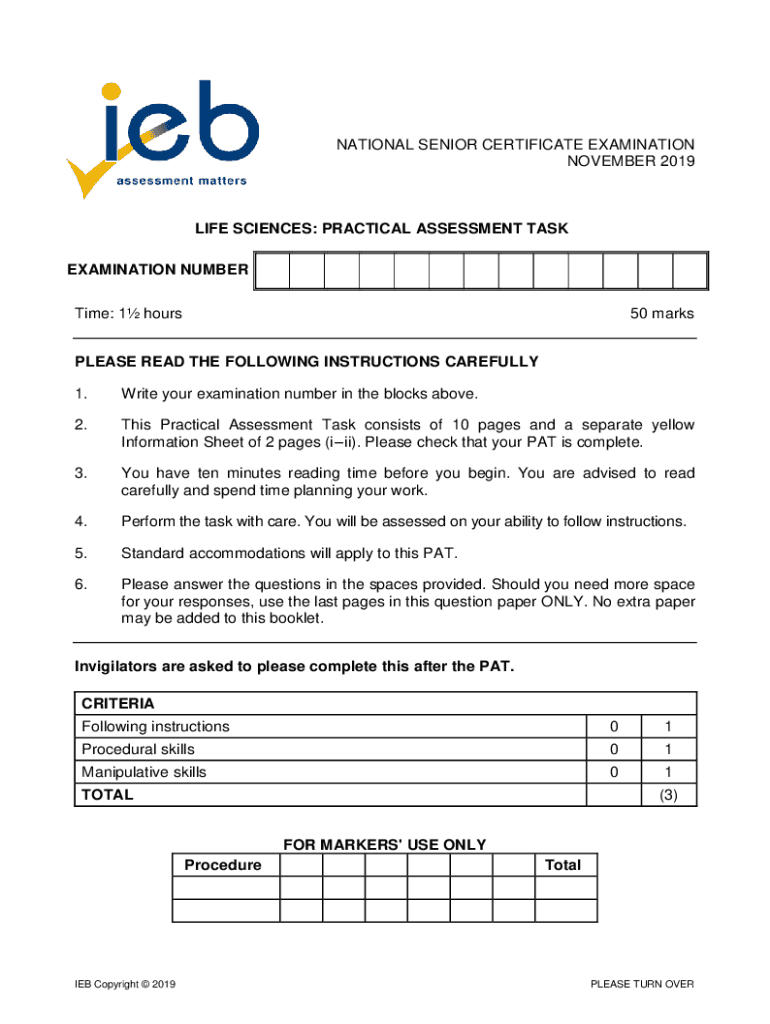 NATIONAL SENIOR CERTIFICATE EXAMINATION NOVEMBER 2019LIFE SCIENCES: PRACTICAL ASSESSMENT TASK EXAMINATION NUMBER Time: 1 hours50 marksPLEASE READ THE FOLLOWING INSTRUCTIONS CAREFULLY 1. Write your