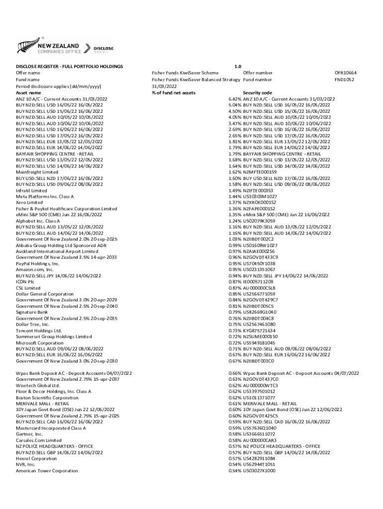 DISCLOSE REGISTER FULL PORTFOLIO HOLDINGS Offer name Fund name Period disclosure applies [dd/mm/YYY] Asset name ANZ 10 A/C Current Accounts 31/03/2023 BUY NZD:SELL USD 16/05/22 16/05/2023 BUY NZD:SELL