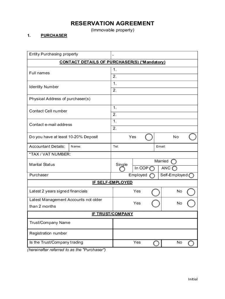 RESERVATION AGREEMENT 1.(Immovable property)PURCHASEREntity Purchasing propertyCONTACT DETAILS OF PURCHASER(S) (*Mandatory) 1. Full names2. 1. Identity Number2. Physical Address of purchaser(s) 1.