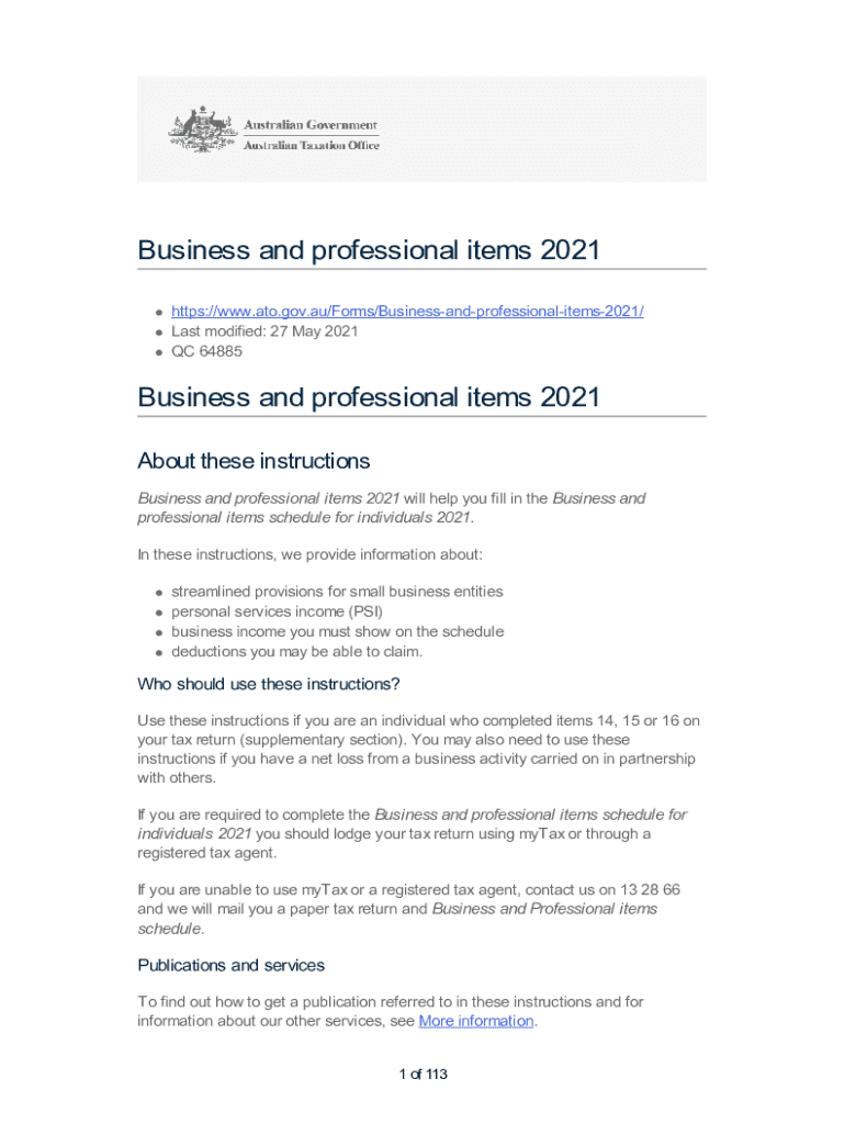 Business and professional items 2021 https://www.ato.gov.au/Forms/Businessandprofessionalitems2021/ Last modified: 27 May 2021 QC 64885Business and professional items 2021 About these instructions