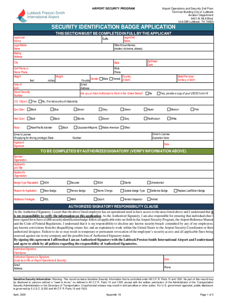 Unit 389 Lubbock, TX 79403SECURITY IDENTIFICATION BADGE APPLICATION