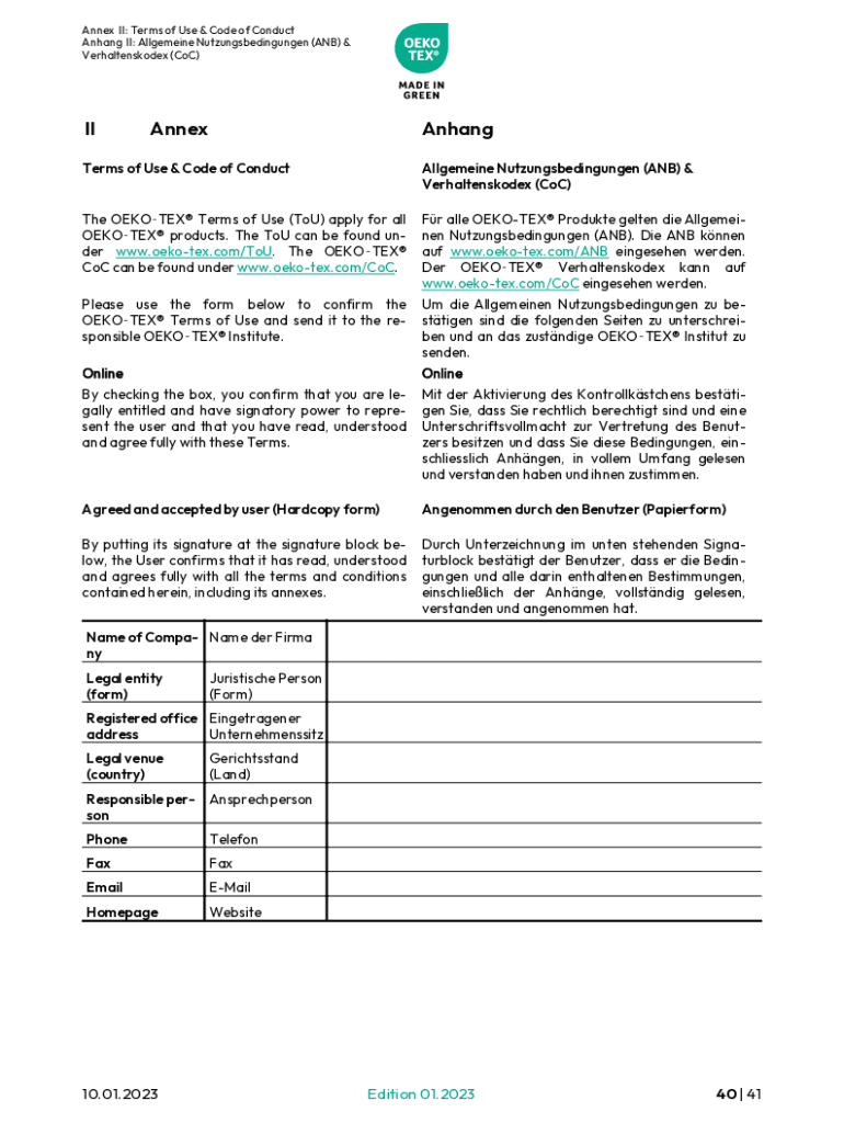 pdfFiller makes it easy to finish and sign oeko-tex made in green online. It lets you make changes to original PDF content, highlight, black out, erase, and write text anywhere on a page, legally eSign your form, and more, all from one place. Create a free account and use the web to keep track of professional documents.