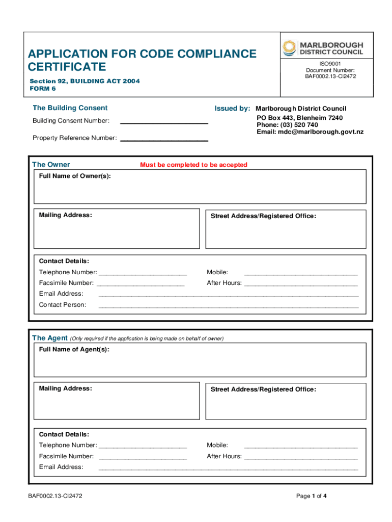 APPLICATION FOR CODE COMPLIANCE CERTIFICATE Section 92, BUILDING ACT 2004 FORM 6The Building Consent Number:ISO9001 Document Number: BAF0002.13CI2472Issued by: Marlborough District Council PO Box