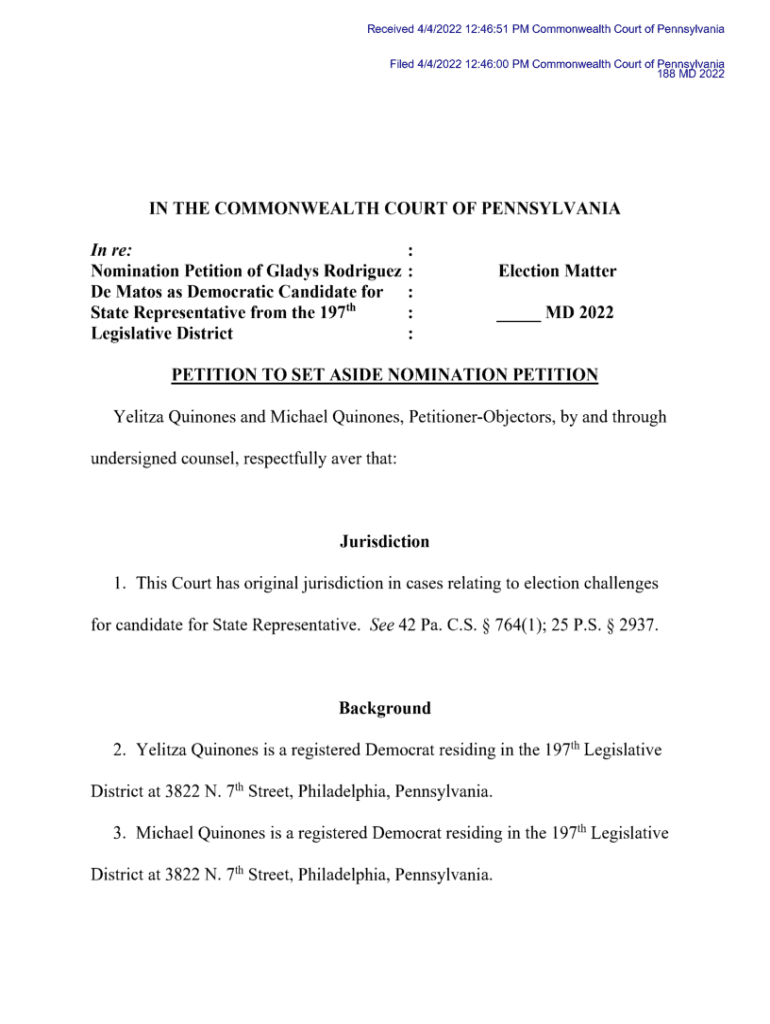 Received 4/4/2022 12:46:51 PM Commonwealth Court of Pennsylvania Filed 4/4/2022 12:46:00 PM Commonwealth Court of Pennsylvania 188 MD 2022IN THE COMMONWEALTH COURT OF PENNSYLVANIA In re: Nomination