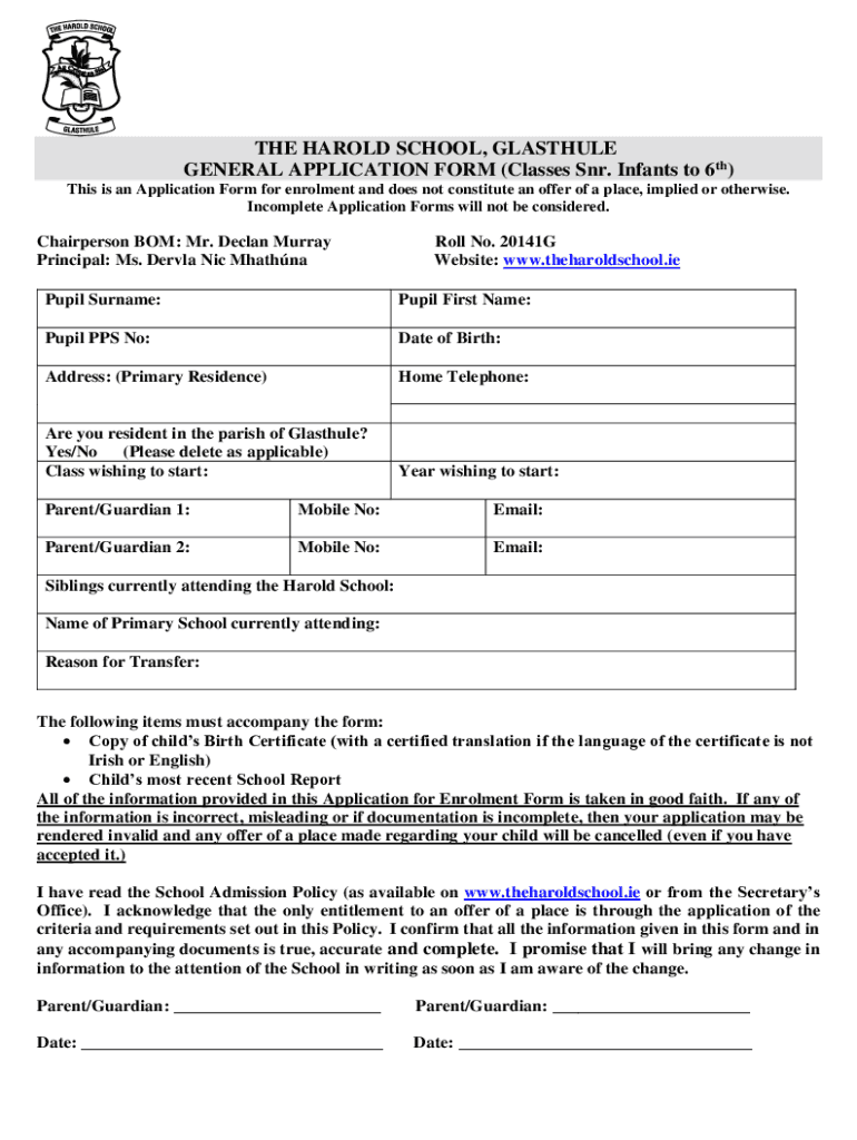 THE HAROLD SCHOOL, GLASSFUL GENERAL APPLICATION FORM (Classes SNR. Infants to 6th) This is an Application Form for enrollment and does not constitute an offer of a place, implied or otherwise. Incomplete