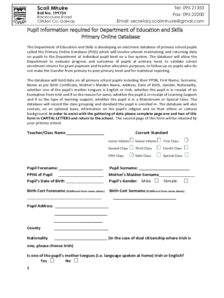 Soil MhuireTel: 095 21353Roll No. 19973V Racecourse Road Clifton Co. Galway: 095 22200 Email: secretary.scoilmhuire@gmail.comPupil Information required for Department of Education and Skills Primary