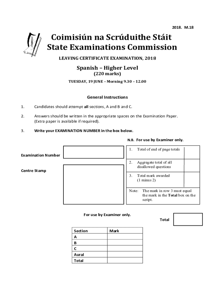 2018. M.18Coimisin Na Scrduithe Suit State Examinations Commission LEAVING CERTIFICATE EXAMINATION, 2018Spanish Higher Level (220 marks)TUESDAY, 19 JUNE Morning 9.30 12.00 GeneralInstructions 1. Candidatesshouldattemptallsections,