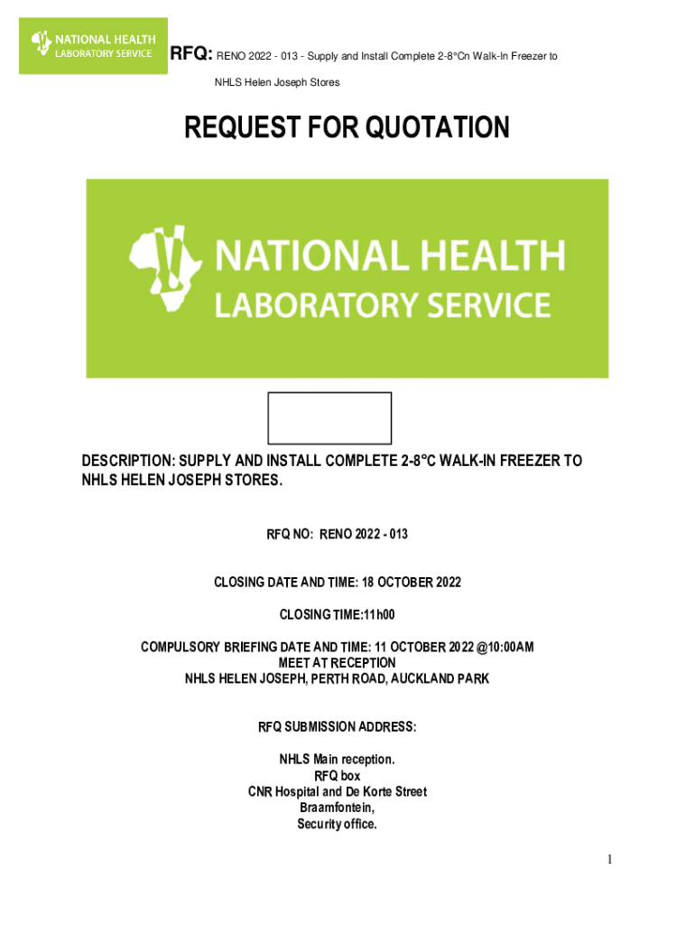 RFQ: RENO 2022 013 Supply and Install Complete 28Cn Walking Freezer to NHS Helen Joseph StoresREQUEST FOR QUOTATIONDESCRIPTION: SUPPLY AND INSTALL COMPLETE 28C WALKING FREEZER TO NHS HELEN JOSEPH