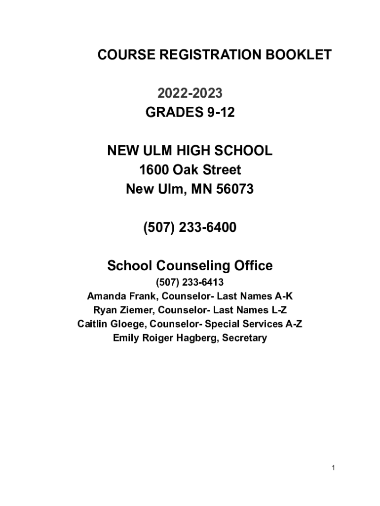 COURSE REGISTRATION BOOKLET 20222023 GRADES 912 NEW ULM HIGH SCHOOL 1600 Oak Street New Ulm, MN 56073 (507) 2336400 School Counseling Office (507) 2336413 Amanda Frank, Counselor Last Names AK Ryan