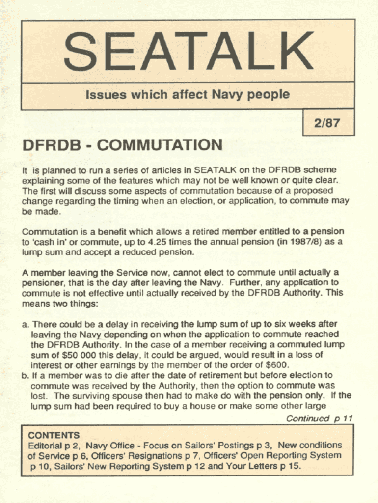 SEAT ALK Issues which affect Navy people 2/87DFRDB COMMUTATION It is planned to run a series of articles in SEAT ALK on the DRAB scheme explaining some of the features which may not be well known