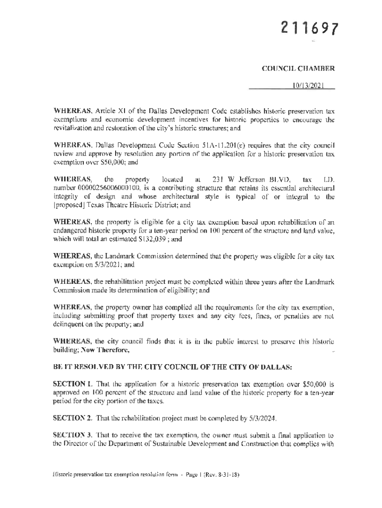 2116e7 COUNCIL CHAMBERt0lt3l202t WHEREAS, Article XI of the Dallas Development Code establishes historic preservation tax exemptions and economic development incentives for historic properties to