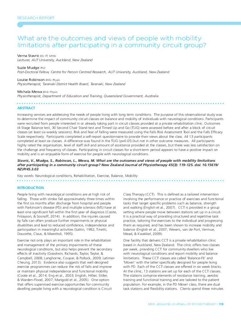 Research ReportWhat are the outcomes and views of people with mobility limitations after participating in a community circuit group? Verna Static B.Sc. PT, MHSC Lecturer, AUT University, Auckland,