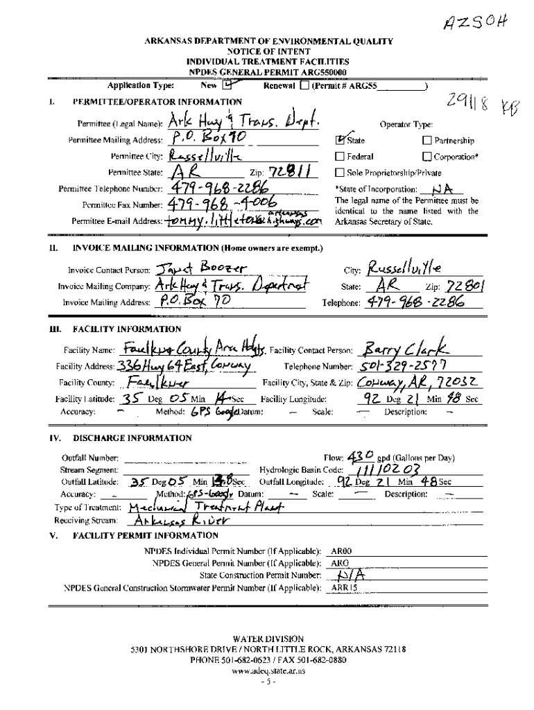ARKANSAS DEPARTMENT OF ENVIRONMENTAL QUALITY NOTICE OF INTENT INDIVIDUAL TREATMENT FACILITIES NODES GENERAL PERMIT ARG550000 New [9?\'* Application Type: Renewal 0 (Permit # ARG55___, I.PERMITTED/OPERATOR