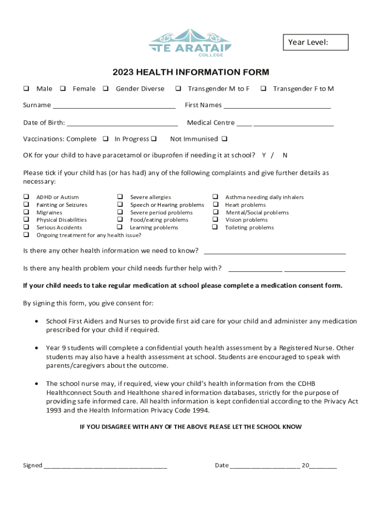 Year Level: 2023 HEALTH INFORMATION FORM Male Female Gender Diverse Transgender M to F Transgender F to Surname ___First Names ___Date of Birth: ___Medical Center ___ ___Vaccinations: Complete In