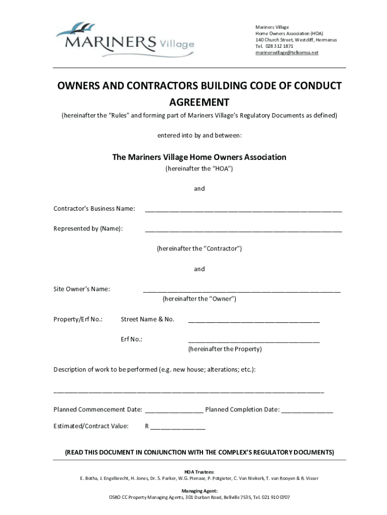 Mariners Village homeowners Association (HOA) 140 Church Street, West cliff, Herman us Tel. 028 312 1871 marinersvillage@telkomsa.netOWNERS AND CONTRACTORS BUILDING CODE OF CONDUCT AGREEMENT (hereinafter