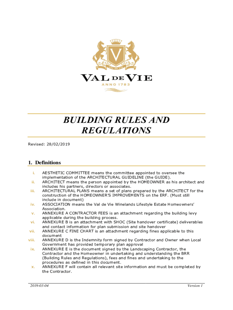 BUILDING RULES AND REGULATIONS Revised: 28/02/20191. Definitions i. ii. iii.iv. v. vi. vii. viii. ix.×.AESTHETIC COMMITTEE means the committee appointed to oversee the implementation of the ARCHITECTURAL