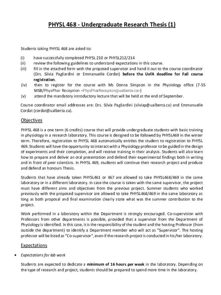 PHYS 468 Undergraduate Research Thesis (1)Students taking PHYS 468 are asked to: (i) (ii) (iii)(iv) (v)have successfully completed PHYS 210 or PHYSL212/214 review the following guidelines to understand