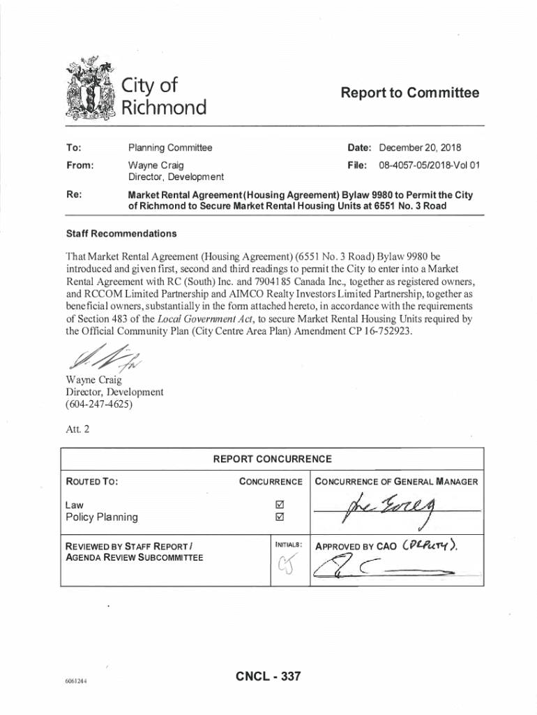 City of RichmondReport to Committee:Planning Committeeman:December 20, 2018From:Wayne Craighill:08405705/2018Vol 01Director, Development Market Rental Agreement (Housing Agreement) Bylaw 9980 to Permit
