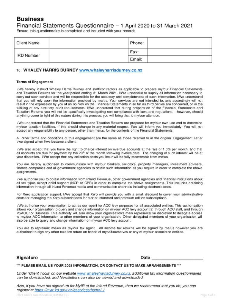 Business Financial Statements Questionnaire 1 April 2020 to 31 March 2021 Ensure this questionnaire is completed and included with your recordsClient Name IRD Humberto:Phone: Fax: Email:WHALEY HARRIS