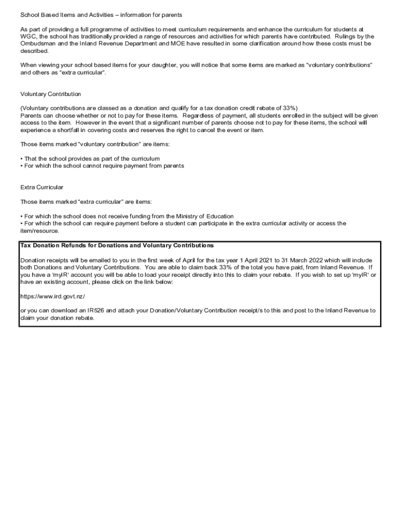 School Based Items and Activities information for parents As part of providing a full program of activities to meet curriculum requirements and enhance the curriculum for students at WGC, the school
