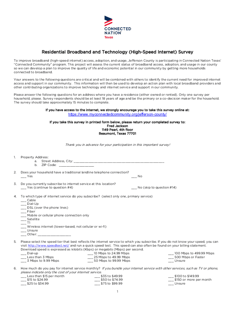 Residential Broadband and Technology (High Speed Internet) Survey To improve broadband (high speed internet) access, adoption, and usage, Jefferson County is participating in Connected Nation Texas