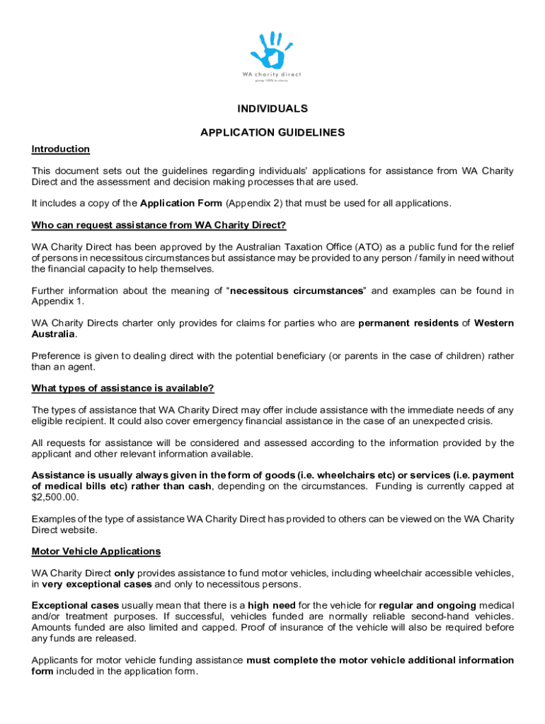INDIVIDUALS APPLICATION GUIDELINES Introduction This document sets out the guidelines regarding individuals applications for assistance from WA Charity Direct and the assessment and decision-making