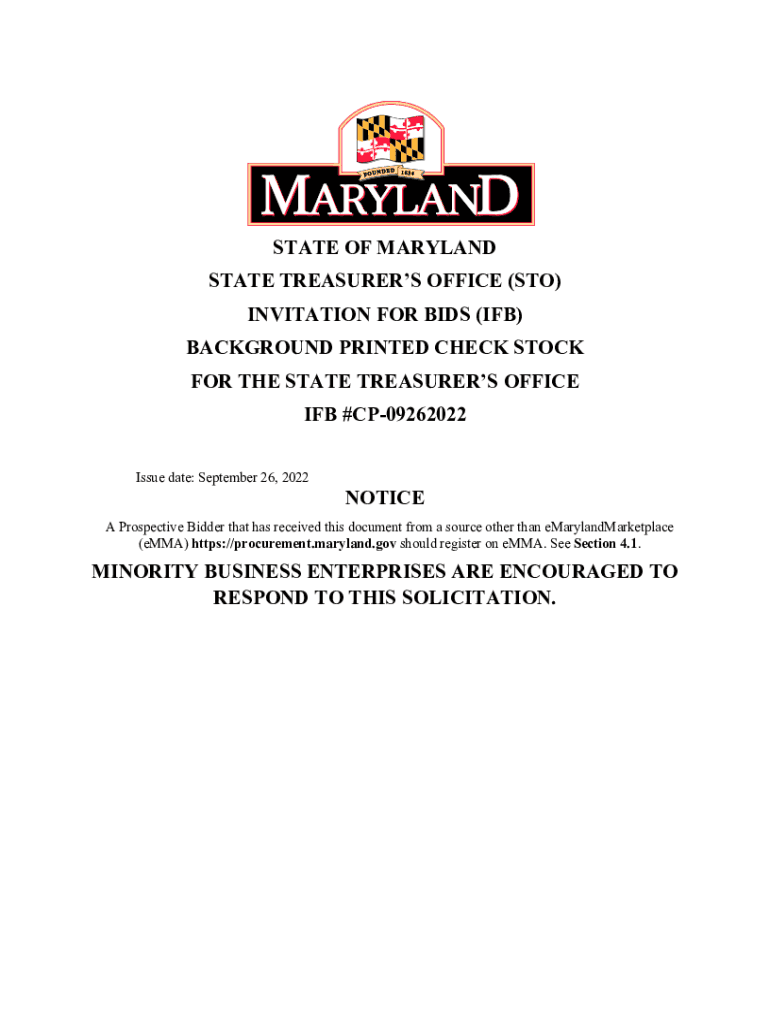 STATE OF MARYLAND STATE TREASURERS OFFICE (STO) INVITATION FOR BIDS (IF) BACKGROUND PRINTED CHECK STOCK FOR THE STATE TREASURERS OFFICE IF #CP09262022 Issue date: September 26, 2022NOTICEA Prospective