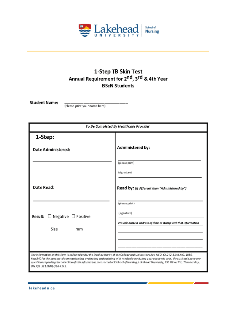 1Step TB Skin Semiannual Requirement for 2nd, 3rd & 4th Year BCN Students Student Name:___ (Please print your name here)To Be Completed By Healthcare Provider1Step: Administered by:Date Administered:(please