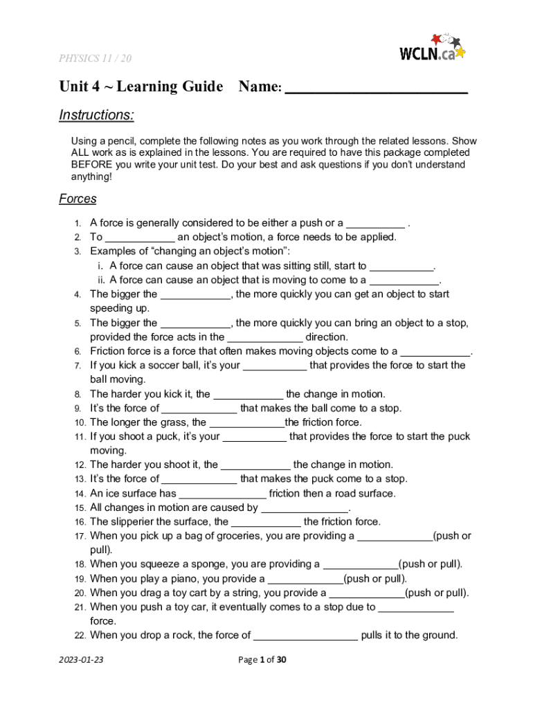 PHYSICS 11 / 20Unit 4 Learning Guidance: ___Instructions: Using a pencil, complete the following notes as you work through the related lessons. Show ALL work as is explained in the lessons. You are