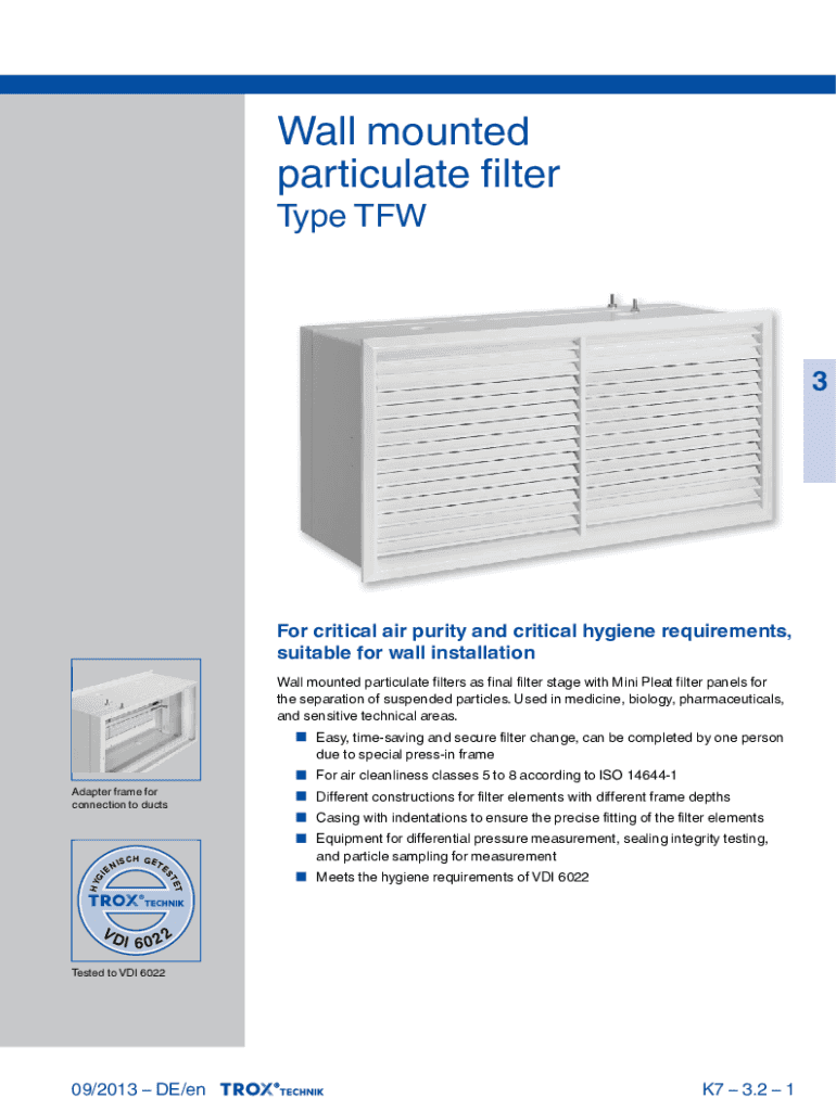 TFWTOC3.2 X XTFWtestregistrierungWall mounted particulate filter Type TFW3For critical air purity and critical hygiene requirements, suitable for wall installation Wall mounted particulate filters
